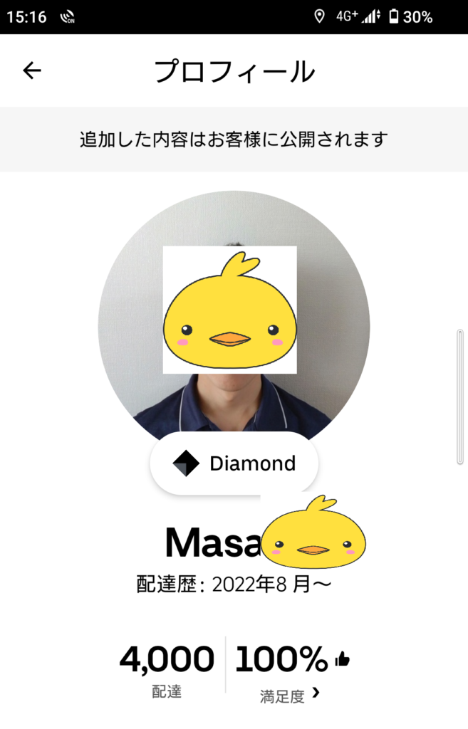 さて、この画像は何かと申しますと、配達時に注文者のスマホ(またはパソコン)の画面に表示される配達パートナーのプロフィールです。